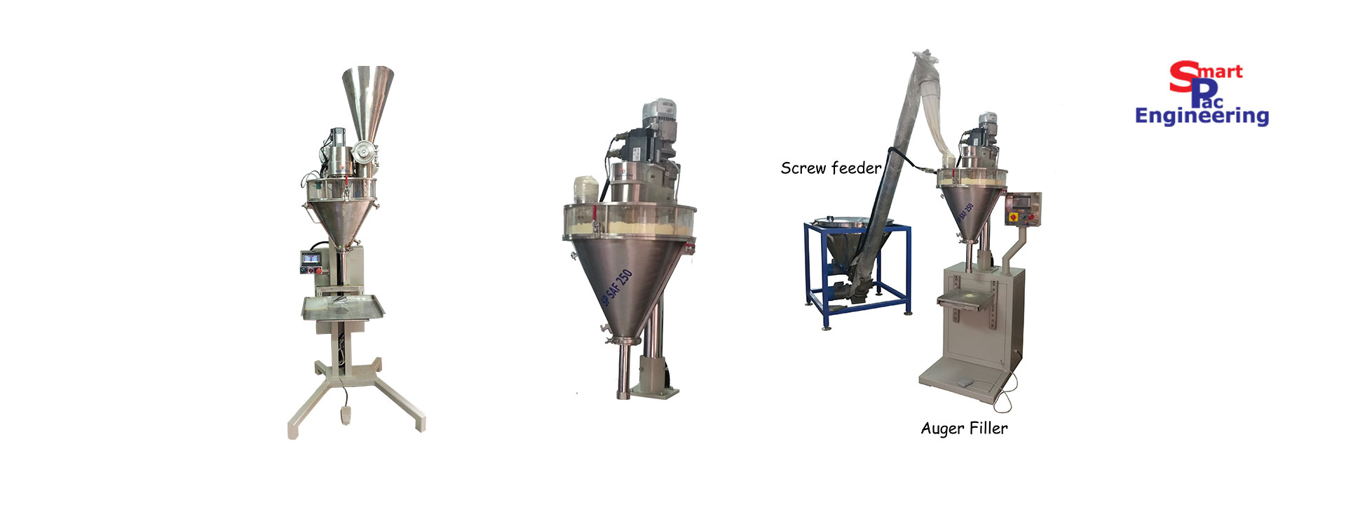 The SMART PAC Semi-automatic auger fillers are an economic quantitative filling solution for dry powders and micro granules. It contains an auger screw which is operated by a servo motor. The motor is controlled by a servo drive and programmable logic controller (PLC). a touch screen based human machine interface (HMI) makes the operation process easy. The product is measured volumetrically by precisely controlling the rotation of the screw and thus controlling the filling volume. The product hopper has a powder level sensor, and it helps the automatic operation of the connected screw elevator for filling more powder inside the hopper when the powder level inside the hopper goes beyond a predefined threshold level. Screw augers are generally used for filling non-free-flowing powders like baking flours and other fine powders but can also be used for measuring and filling free flowing powders like sugar and salt with an additional attachment introducing additional friction to reduce or stop the free-flowing property of such powders. It comes with different customized sizes of auger screws to cover a wider filling range and versatile, semi-automatic and rugged product filling equipment. It has two models to choose from depending on the maximum filling weight.