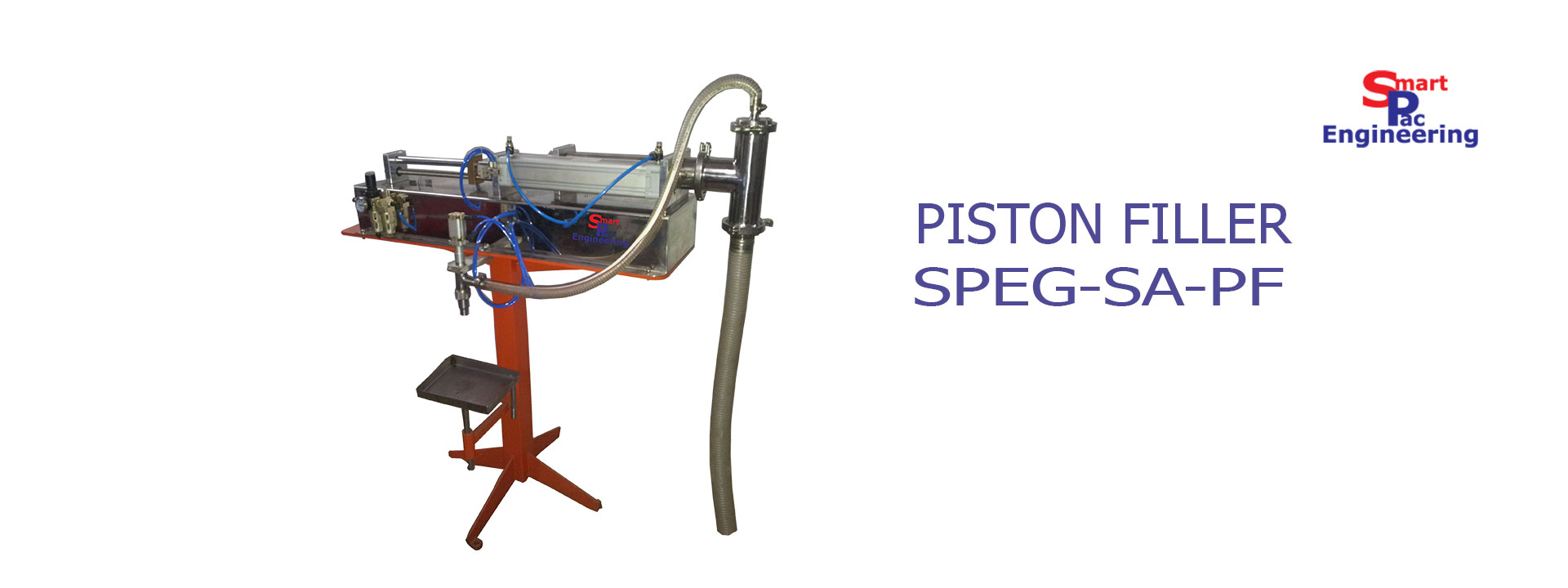 SPEG-SA-PF-100 This method typically uses a piston filler to dose the sachets or jar. The advantageous of the piston filler is one can have it graded to dispense products from water to toothpaste. The workings of the piston filler are very much the same principle as the piston in a combustion engine. When the piston draws back it fills the chamber with the liquid and on the return dispatches the liquid into the Jar or formed bag below.